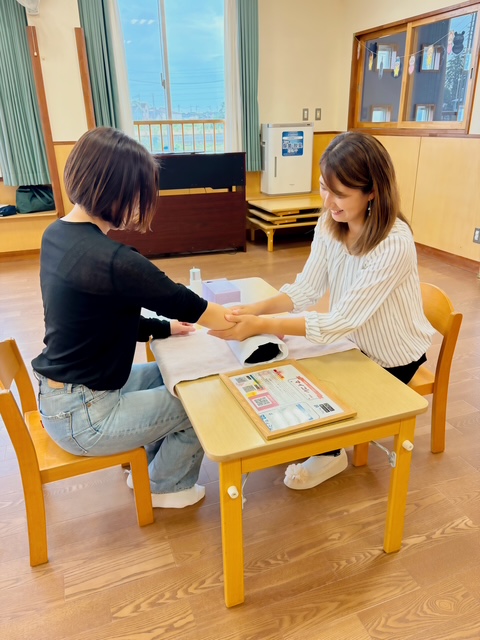 マッサージを始めさせていただくと「パンパンに浮腫んでいた手がフワ〜っと流れている感じ!ながれている〜ながれている〜」と言ってくださり、ママさんたちと大笑い😆